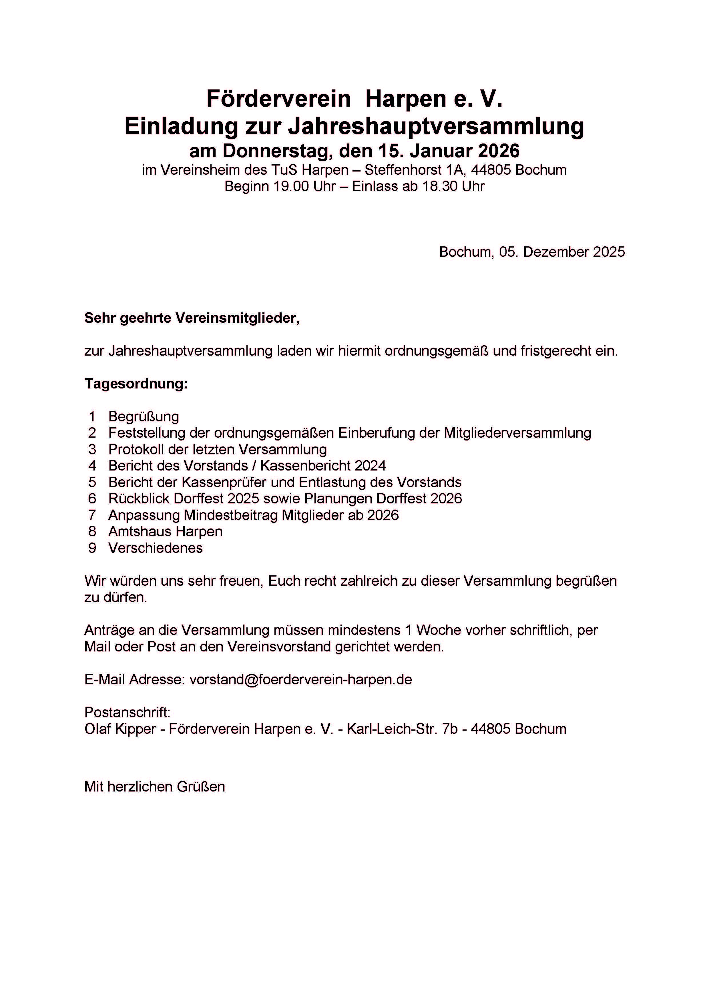 Wir wollen die sozialen Bestrebungen die dem Zusammenleben der Bürgerinnen und Bürger im Stadtteil Bochum-Harpen und darüber hinaus dienen fördern und das Gemeinschaftsleben stärken. Wir unterstützen Harpener Vereine bei der Durchführung ihrer Vereinstätigkeiten im Sinne von Brauchtum und Tradition.